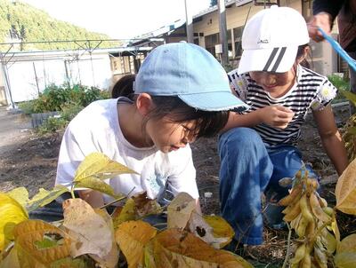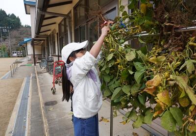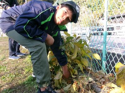 4年生が総合的な学習の時間で育ててきた大豆を収穫しました。運動の隅や学級園に植えた大豆がたくさん収穫できました。中の実も大きく育っていました。校舎の前で干していきます。これから、地域の人に教えていただきながら、豆腐や金山寺みそをつくっていくようです。