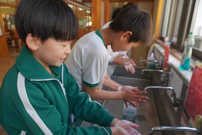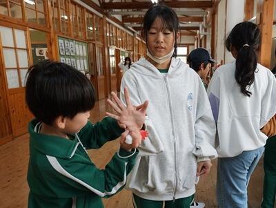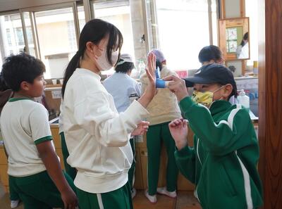 保健給食委員がよい手洗いの習慣をつけてもらおうと「ポンスタンプ」を使った手洗いを企画しました。委員の子からスタンプを押してもらった子どもたちは、それが落ちるまで丁寧に手洗いをすることができました。毎日、長い放課が終わるときに実施されます。全校の健康管理をよく考えて活動しています。