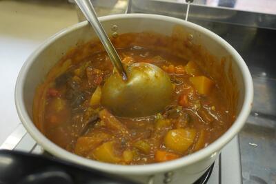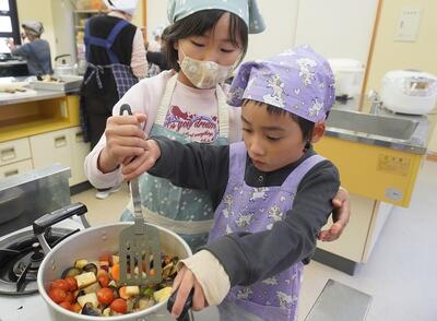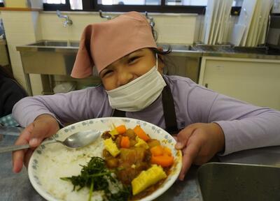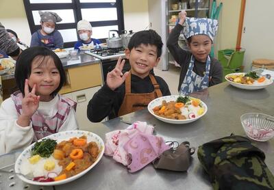 2年生が、今年学級園で作った野菜の入った夏野菜カレーづくりに挑戦しました。自分たちでつくった野菜なので、心を込めてつくりました。いろいろな野菜がたくさん入った栄養満点のカレーができました。
