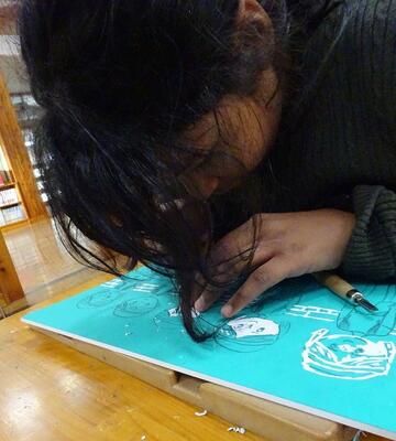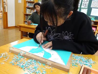 6年生が図工の時間に「版画」の制作の学習をしました。さすが6年生ともなると、白と黒になるところを想像して、構図も考えて彫ることができていました。今年の思い出を版画にしたいと、今年学習した「花祭り」を題材にした作品が多かったようです。