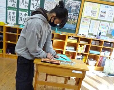 3、4年生が図工の時間に「版画」の制作の学習をしました。初めて使う彫刻刀に緊張しながらも思い思いに楽しんで彫っていました。下絵の黒い線が白くなることにびっくりしていましたが、出来上がったときには、大満足でした。