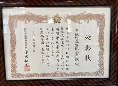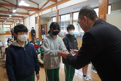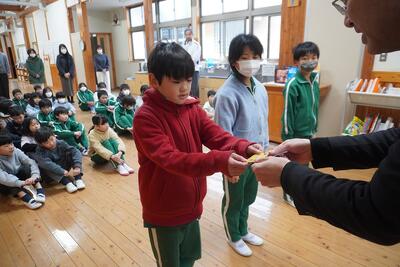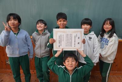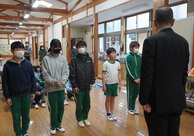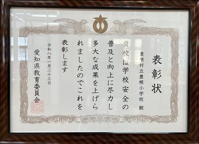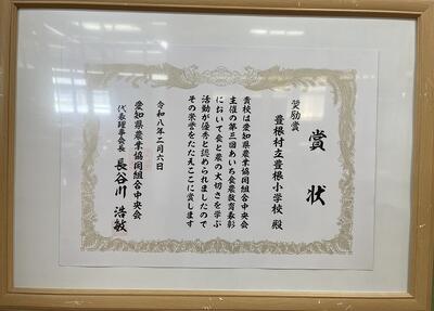 全校朝礼で、豊根小学校に対して受けた各種の表彰を紹介しました。「第3回あいち食農教育表彰」奨励賞、「学校安全教育」優良校、「200日間自転車無事故無違反ラリー」表彰です。特に、「第3回あいち食農教育表彰」では、今年度、4年生が総合的な学習の時間に取り組んできた、大豆を育てて地域の郷土料理である金山寺みそを作って普及活動に貢献したことが認められました。