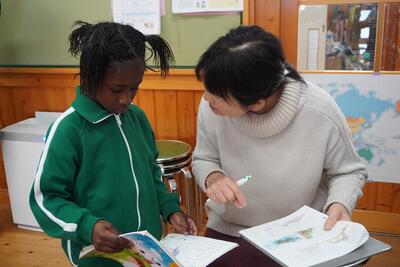 1年生の国語の授業を見合う会を行いました。今日の学習のめあては、第4場面の「スイミーの気持ちを考えよう」でした。ねらいをもって音読の仕方をいろいろと工夫したり、ペープサートを使って演技をしたりして、スイミーの気持ちにせまる読みを深めていきました。自分のことばで意見を言えていて、その理由もしっかりと発表し合っていました。