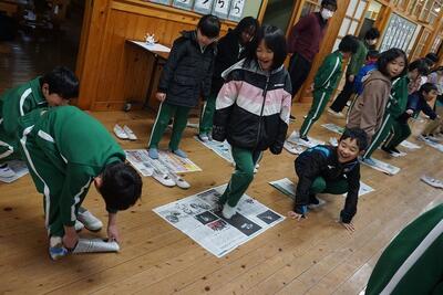 朝の元気タイムの時間に、どれだけ新聞紙に乗れるかゲームをしました。じゃんけんで負けたら、新聞紙を半分に折っていき、どれだけ小さくなるまで乗れるか競いました。だんだん小さくなっていくと、バランスをとるのが難しそうでしたが、楽しくできました。