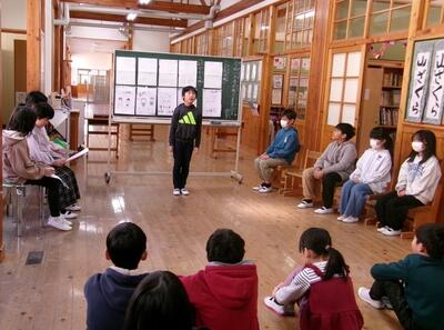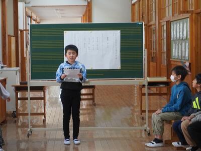 4年生が、総合的な学習の時間で頑張った活動内容を朝礼の時間に全校児童に向けて発表しました。今年1年かけて追究してきた、大豆の種まきから収穫、金山寺みそづくりまでの学んだことをロイロノートでまとめて発表しました。聞いた子どもたちから、「4年生が力を合わせて大豆を育てて金山寺みそをつくったことがすごいと思いました。」などと感想をもらいました。とても励みになったと思います。よく頑張りました。
