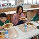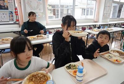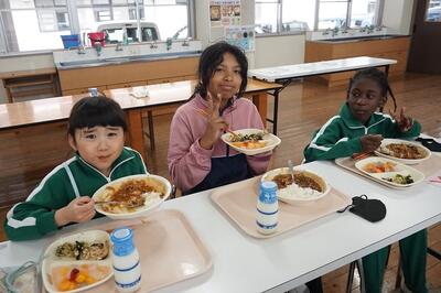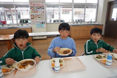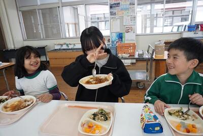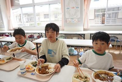 卒業をする6年生との交流給食を行ってきました。最後は、1・2年生と一緒に給食を食べました。いつも、1・2年生が食べているランチルームに6年生が行って、6年生を囲んで食べました。6年生と一緒に楽しく会食して、また一つ思い出をつくることができました。
