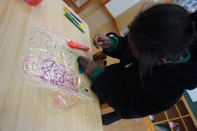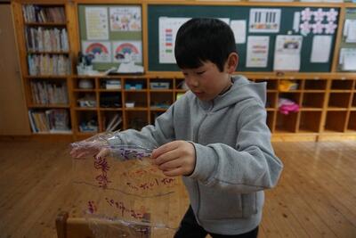 1年生が生活科の時間に凧をつくって凧あげをしました。昔の遊びシリーズで、簡単にできるビニールと棒でつくりました。まだ雪の残る運動場に出ると、思い思いに走り、凧の上がり具合を真剣に確かめていました。