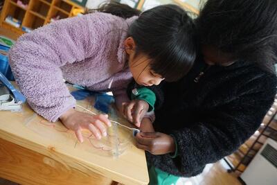 5年生が、図工の時間で、豊根小学校の冬の季節を感じながら好きな場所を選んで風景画を描いています。それぞれ好きな構図を真剣に探して夢中になって取り組んでいます。