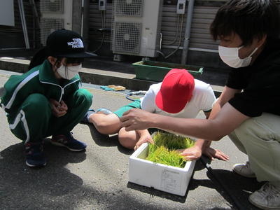 5年生がJAの方にきていただきお米作りを教えていただきました。この日は田植えに挑戦しました。この学習をとおして、お米作りの大変さを知り、「食」への感謝の気持ちが高まるとよいです。