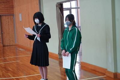 本年度最初の朝礼を小中学校で合同で行いました。児童会と生徒会の役員が司会を交代しながら、小中学校の職員が自己紹介を行いました。4月の異動により顔ぶれも変わりましたので、小中学校それぞれの児童生徒に顔を覚えてもらいました。小中連携で行うことも多いので、しっかりした態度で職員の話を聞いていました。