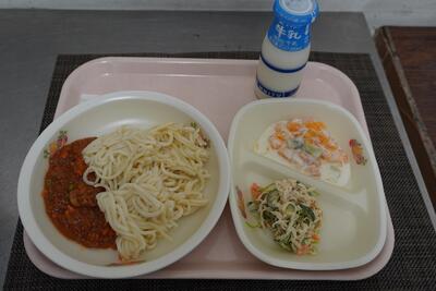豊根小学校では、初めて給食でソフト麺が提供されました。ソフト麺をミートソースに絡めて食べました。一つ一つ袋に入っていて、温かくて、子どもたちからも「とてもおいしかった」と好評でした。これからは、月に1回ソフト麺が出ます。とても楽しみになりました。