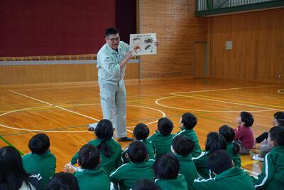 本年度の稚鮎放流体験は、あいにくの雨のため、体育館の中で、稚鮎の観察、稚鮎と触れる体験を行いました。豊根村商工会の方、組合長さんをはじめ大入川漁協のみなさま、水産試験場の方にお越しいただき、鮎について学ぶことができました。子どもたちは、元気のいい鮎にたくさん触れて大喜びでした。最後に、稚鮎を給食で出していただけるということを聞くと、「かわいそう」と思わず声が聞こえました。楽しい体験をありがとうございました。