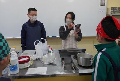 3・4年生が、総合の学習の時間に、ブルーベリー大福をつくりました。講師として、地域おこし協力隊の内田さんご夫妻が来てくださいました。内田さんは、この日のためにブルーベリー大福のレシピを考えてきてくださいました。大福の中に入れるものは、3・4年生が1学期に学校の横の畑で収穫したブルーベリーにグラニュー糖とレモン汁を混ぜて煮込んだジャムとクリームチーズです。クリームチーズにもグラニュー糖とレモン汁をよく混ぜて丸めました。最後に伸ばした大福の皮に包んで出来上がりです。子どもたちは、「とてもおいしい」と、一人一つずつの貴重な大福をおいしくいただきました。内田さんご夫妻、ご指導ありがとうございました。