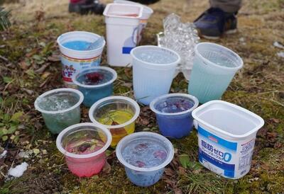 1年生が、生活科の時間に色氷づくりをしました。思い思いの容器に水を入れ、好きな色を付けて学校の周りのいろいろな場所に置いておきました。一晩経って見に行ってみるときれいな氷ができていました。豊根ならではの学習ですね。どんな場所がよくできたかな。よい発見ができましたか。