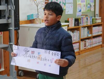 朝礼の時間に図書委員が読み聞かせを行いました。まず、図書委員会の2月のめあてを発表しました。「いろいろな種類の本を読もう」です。その後、1年、2年、3・4年、5年、6年の教室に分かれて、それぞれの発達段階に応じた紙芝居を読んでくれました。この日のために図書委員の子たちは一生懸命に練習をしてきました。とても上手に読み聞かせをして、みんなしっかりと聞いていました。