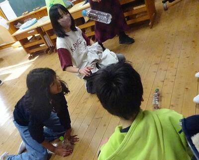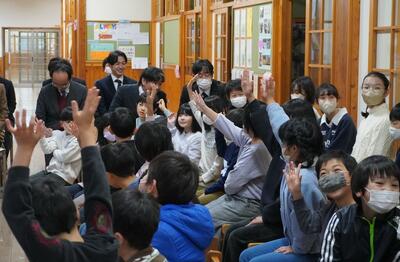 全校朝礼でお話タイムを行いました。今回のテーマは、「好きな動物」です。仲良し班グループに分かれて、それぞれの好きな動物について話をし、質問したり答えたりしました。友だちの話をよく聞いたり、関心をもったりして、たくさんコミュニケーションがとれました。