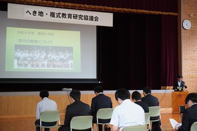 令和6年度の愛知県へき地・複式教育研究協議会の研究発表会が本校で開催されました。開会行事の中で、教育長さんから「子どもたちは豊根村の宝物です」というご挨拶があり、身の引き締まる思いでした。研究概要の発表の後、1年生の国語、3・4年生の算数、5年生の算数の授業を公開しました。目を輝かせて授業に取り組む子どもたちの姿は、まさにきらきらと輝く宝物のようでした。授業後の研究協議会では、多くの参加者から子どもたちをほめていただいたり、授業に対してのご指導をいただいたりして、とても実のある研究発表会となりました。ご指導いただきました助言者の先生方はじめ、運営に携わっていただきました多くの関係者のみなさま、本当にありがとうございました。