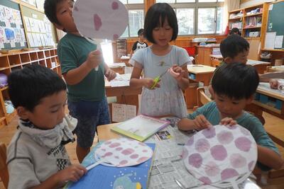 1年生が、先日アサガオの花で染めた半紙でうちわをつくりました。洗濯のりでうちわに半紙をはり、うちわの形に切りました。模様がとても素敵な世界に一つだけのうちわができました。