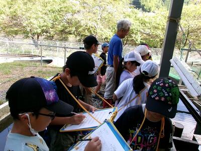 3・4年生が、総合的な学習の時間に、熊谷さんのチョウザメのいけすを見学させていただきました。チョウザメを育てる方法や大変さを教えていただき、真剣にメモをとってきました。チョウザメの稚魚を実際につかませていただき、そのかわいらしさに子どもたちも感動していました。稚魚をいただいて、教室で飼う計画も立てたようです。これからも楽しみです。ありがとうございました。