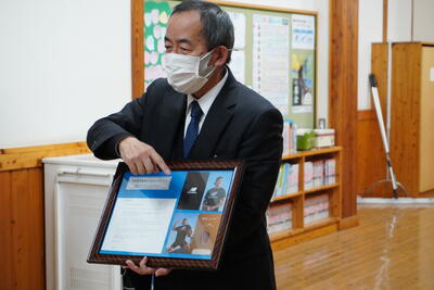 先週のうちに大谷選手からお送りいただいたグローブが届きました。どのように披露するか、6年生に意見を聞き、その内容で披露することにしました。児童会長に渡して、児童会長がクローブをつけて、始球式のボールを受け取るように考えてくれました。月曜日の朝、臨時の全校朝礼を行いました。最初にお手紙を読み、サイン入り写真を紹介し、その後で、柔らかいボールを校長が投げ、グローブをつけた児童会長がキャッチして、お披露目の会としました。お手紙と写真付きカードは、広い廊下の一角に飾り、しばらくは、柔らかいボールを使って廊下でキャッチボールができるようにし、子どもたち全員に触ってもらいたいと思います。会が終わると代わるがわる嬉しそうにグローブをはめていました。大谷選手、グローブありがとうございました。