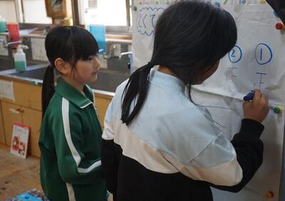 1年生の国語の授業を見合う会を行いました。今日の学習のめあては、第4場面の「スイミーの気持ちを考えよう」でした。ねらいをもって音読の仕方をいろいろと工夫したり、ペープサートを使って演技をしたりして、スイミーの気持ちにせまる読みを深めていきました。自分のことばで意見を言えていて、その理由もしっかりと発表し合っていました。