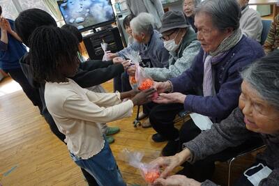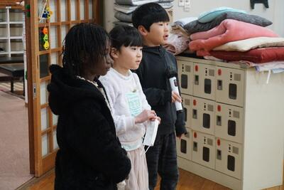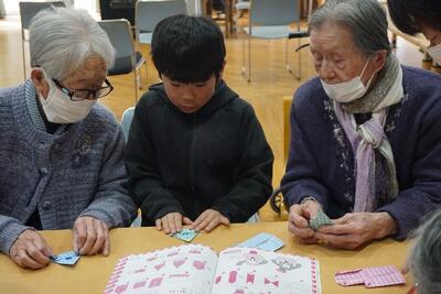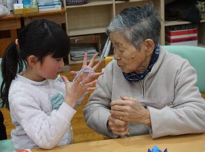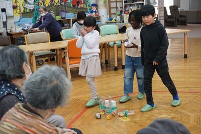 1年生が生活科の時間に、ポンタの里へ行きました。10月には、ポンタの里の利用者さんが豊根小学校に来てくださり、今度は、子どもたちが行く計画を立てました。1年生の三人は、ポンタの里で一緒に遊ぶ道具を持って行って、折り紙やお手玉、あやとりなどを教えていただきながら一緒に楽しむことができました。ボウリングは、みなさんに楽しんでもらおうと生活科の時間に作ったものです。最後には、利用者さんがティッシュで作られたかわいい置物をプレゼントしてくださいました。学校とポンタの里の行き来の交流が進んでいくといいなと思いました。