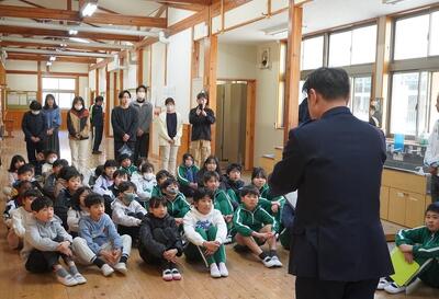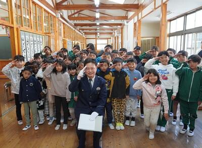 坂宇場駐在さんの最後のお話 投稿: 校長 (13:00) カテゴリー: 今日の出来事 ずっと子どもたちが慕っていた坂宇場駐在の平山さんが、学校に見えて、全校児童に向けて最後のお話をしてくださいました。「交通安全に気をつけてください」「知らない人にはついていかないようにしてください」など、安全に気を気をつけるよう、お言葉を残してくださいました。その後、護身術も教えていただきました。平山さん、今まで、子どもたちのために、本当にありがとうございました。 Tweet -