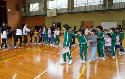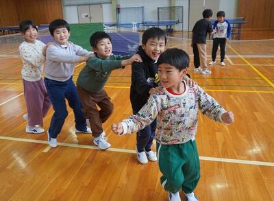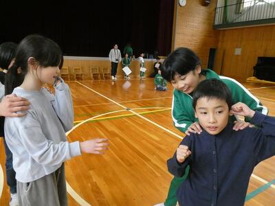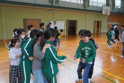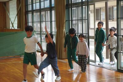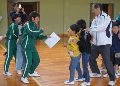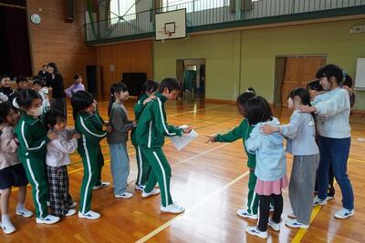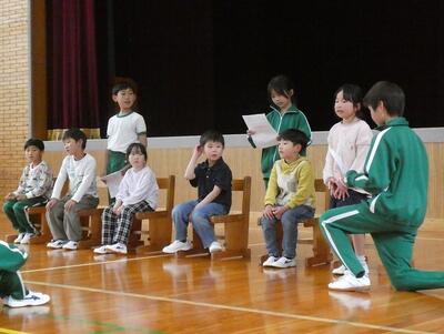 1年生を迎える会 投稿: 校長 (12:29) カテゴリー: 今日の出来事 児童会執行委員が主催して、「1年生を迎える会」を行いました。1年生にインタビューをしたり、全校で「じゃんけん列車」をして遊んだりして楽しむことができました。1年生の6人も上級生と一緒になって、たくさん体を動かしてうれしそうでした。全校で1年生を迎え、これから豊根小学校全校児童で力を合わせていこうとする温かい雰囲気が感じられました。 Tweet -